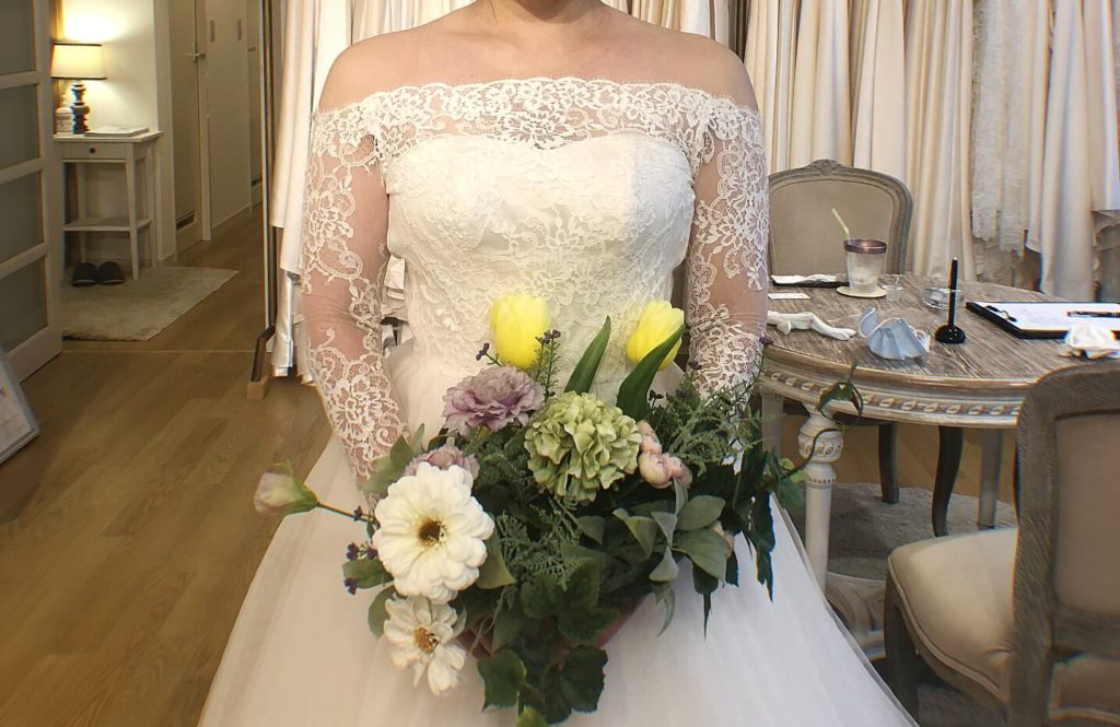 最初に試着したのはレース素材のオフショルダーが特徴のドレス。(お目汚し失礼します)