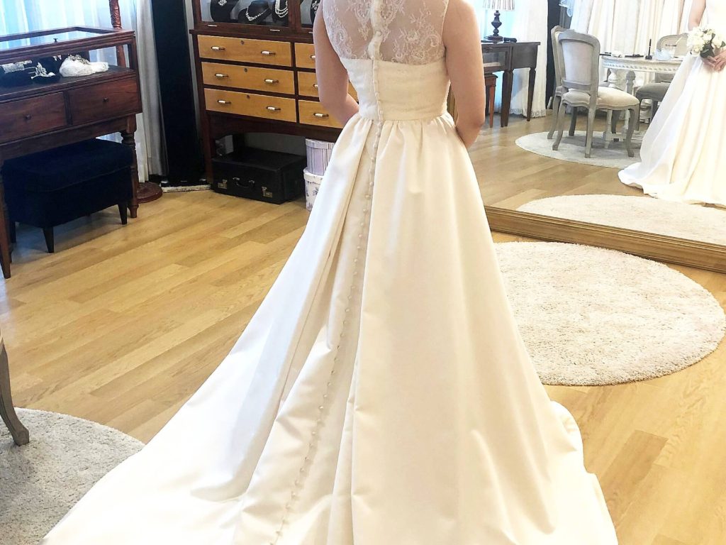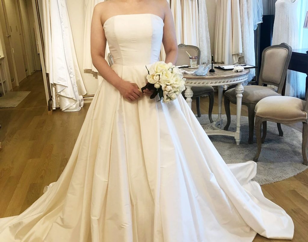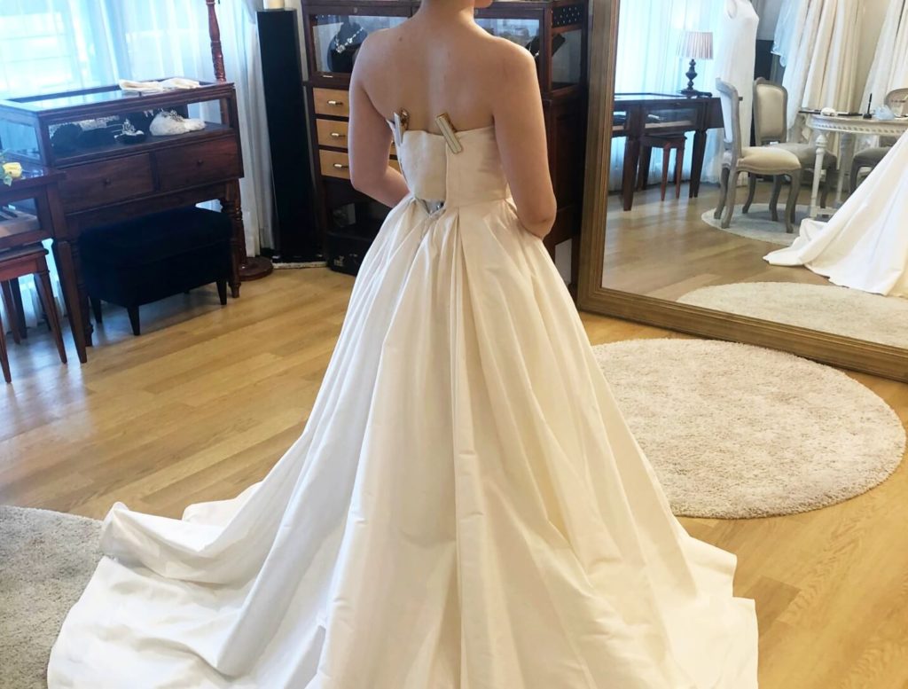 最後に試着したのはシンプルなミカドサテンのビスチェタイプのドレス。