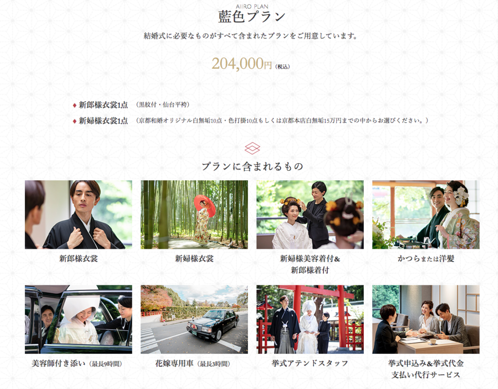 私は上賀茂神社に直接婚礼を申し込み、初穂料の支払いをしました。その際に神社の婚礼部の方から「上賀茂神社の衣装プラン」を紹介いただきました。