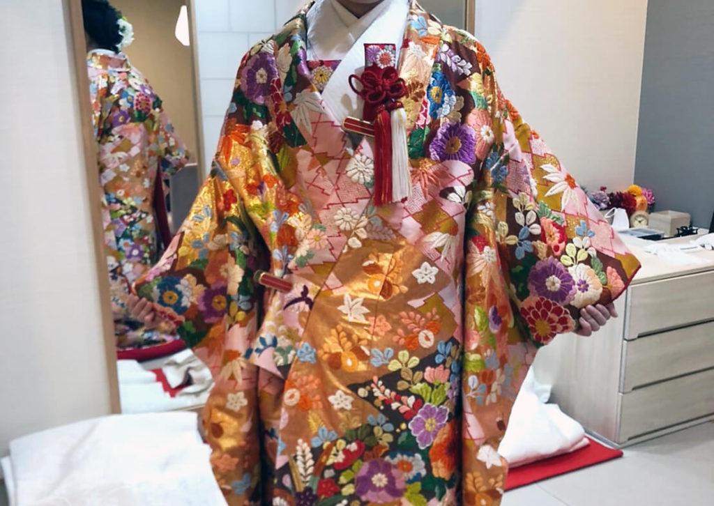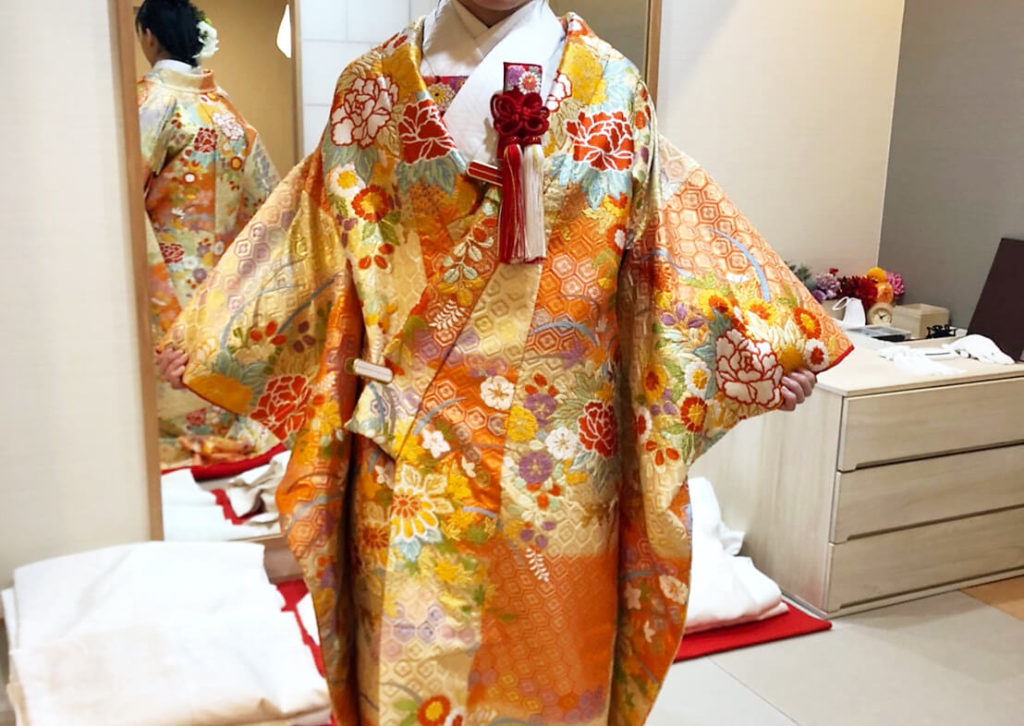 私は神社での挙式では白無垢、披露パーティーでは色打掛を着る予定です*
