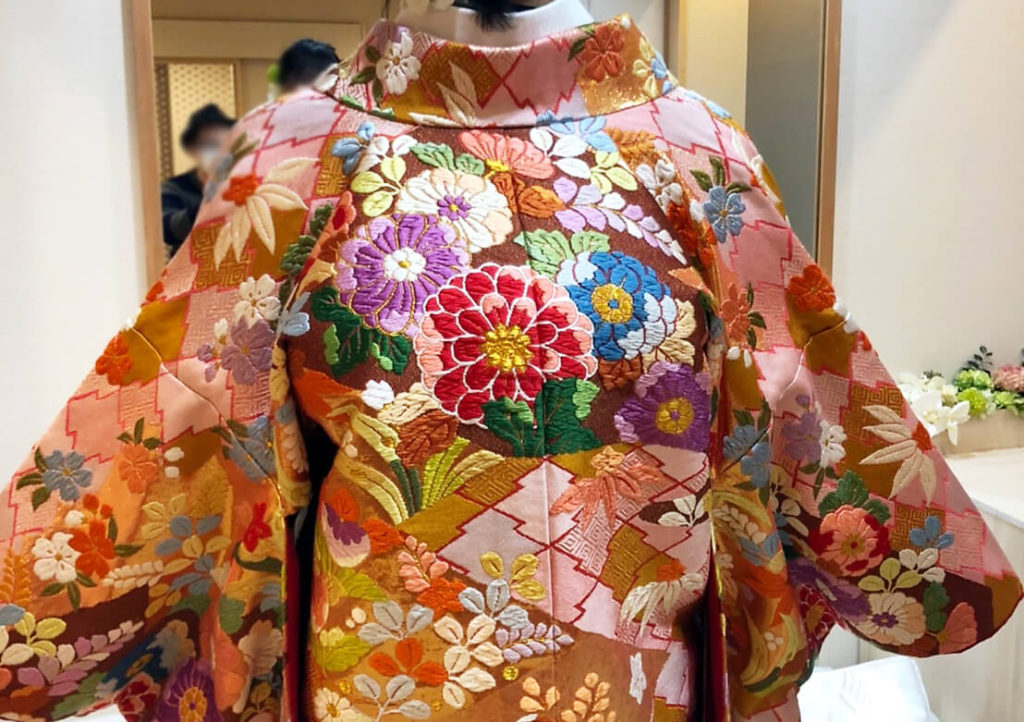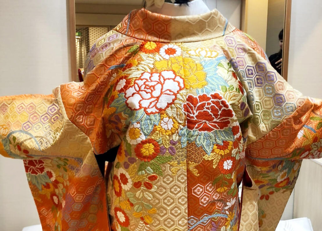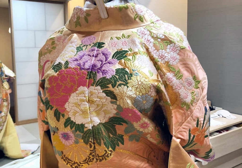 職人さんが手織りで数ヶ月の期間をかけて丁寧に作り上げた色打掛ということで、とっても刺繍がゴージャスで迫力あります。